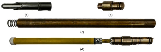 Let us take a detailed look at the design and layout of the module from left to right. The guide tip (Figure 12a) is intended for sealing the module and for its landing in the guide sleeve, which is installed in the orienting adapter of the drill string. A two-pin adapter with sealing rings (Figure 12b) is required to connect the guide tip to the main body. The main body of the module (Figure 12c) contains a power element with a Smart 4 controller and a shock-absorbing spring in its inner cavity. The power battery is connected to the housing, which has a ventilation valve, through a support with a built-in cable, which plays the role of an MDM 9/Kintek adapter (Figure 12d). The Kintek connector is fixed with a special fastener and closed with a short upper case. The fishing neck (Figure 12f) is designed to seal the internal cavity of the module, and if necessary, it provides the possibility of lifting the module on a geophysical cable.