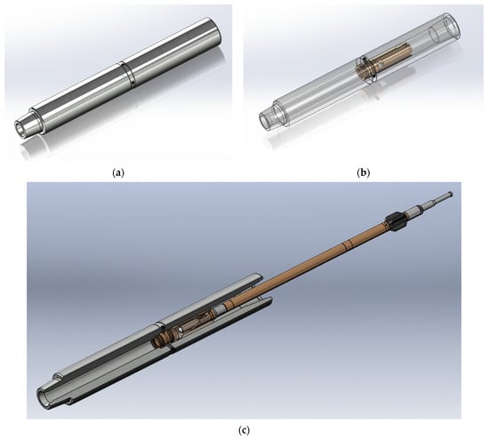 After the module is assembled, it should be placed in the housing elements for its final installation at the bottom of the drill string. For this, it was decided to use a landing adapter (Figure 13a), into which the guide sleeve is installed, and the lower end of the module (guide tip) enters the sleeve itself. The sleeve is fixed with screws so that it does not turn and cannot move in the axial direction (Figure 13b). There is a special wedge in the sleeve, and a groove in the guide tip of the module. The wedge enters the groove, and the module remains in the fixed position (Figure 13c). The part of the module that protrudes beyond the landing adapter is hidden in a specially made pipe or in an element of a weighted drill pipe using an internal rubber centerer.