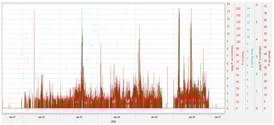 In order to carry out a detailed study of the origin and causes of the detected damage, information was read from the memory of the pitting vibration recording device (the reading was carried out in the field). The diagram of all parameters of the measured oscillations and shocks is presented in Figure 15. Of course, the absolute value of acceleration is measured in the SI system in . However, on the accelerogram, the unit of measurement is the acceleration of free fall ().
