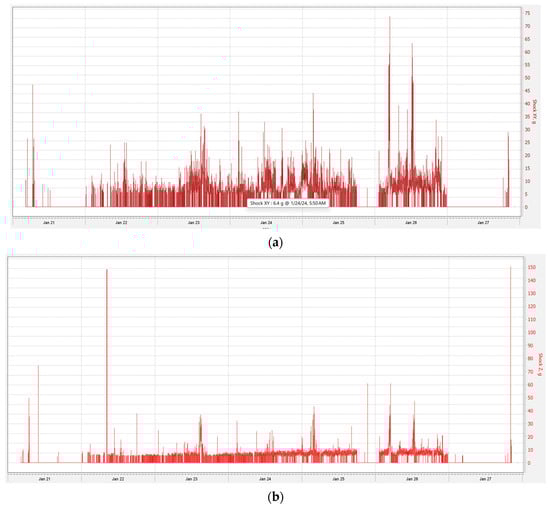 Registration of shocks in three mutually perpendicular directions during the first trip: (a) Change in the shocks in lateral directions; (b) Changes in the shocks in the axial direction.