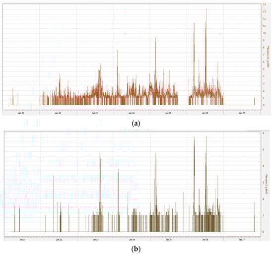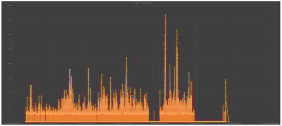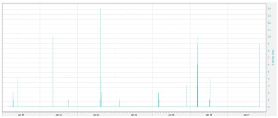 Figure 18 shows the dependence of “Num Shocks Z” on time. It should be noted here that the measurement takes place in the “CPS Mach (AMx)” mode. Let us reveal each component of the methodology of this measurement: CPS is an abbreviation of “cycles per second”, which, in our case, means the number of repetitions of shocks per second; mach (AMx) means “maximum amplitude”, which indicates the largest magnitude of shocks detected during measurement. Thus, the dependence in Figure 18 displays the number of shocks in the axial direction, which is measured by the “CPS mach (AMx)” method, and the vibration sensor registers shocks during drilling with an accuracy in relation to the number of oscillations per second, taking into account the maximum amplitude of the magnitude of these oscillations. For example (see Figure 18), a dangerous event was registered on January 23, in which 14 shocks of maximum amplitude in the axial direction occurred within one second.