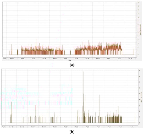 Registration of vibrations in three mutually perpendicular directions during the first trip: (a) Vibrations in the lateral directions; (b) Vibrations in the axial direction.