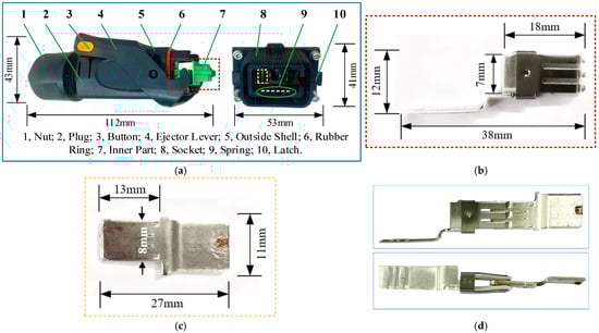 Sample photos. (a) Socket and plug; (b) female terminal; (c) male terminal; (d) mated state.