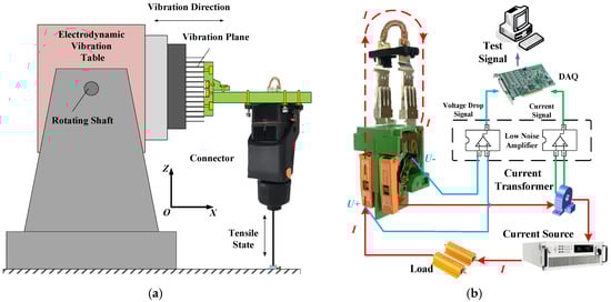 The measurement module is designed to record the contact current and the contact drop signals in real time. A Hall-effect current sensor (LHB-Y2, XINGHUI, Yueqing, China) is employed to characterize the contact current with a resolution of 0.05 A. The contact voltage drop signal is processed by low-noise amplification and low-pass filter. The measurement module is configured for the four-wire method, which could eliminate the lead resistance including the resistance of soldered joints. All the above signals including contact current and contact voltage drop are collected by the data acquisition system (PCI-1716, ADVANTECH, Taiwan) with a sampling rate of 250 kHz and measurement resolution of 16 bits. The ECR could be calculated by the ratio of the voltage signal and contact current, and the accuracy of the ECR is within 1% after calibration. The data acquisition, storage, and processing are controlled by a PC with the help of LabVIEW software 16.0.