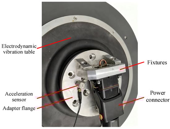 The test rig (shown in Figure 2) consists of two parts; that is, the mechanical vibration excitation module and the measurement module. The periodic sine vibration is provided by the electrodynamic vibration table (DC-300-3, SUSHI, Suzhou, China). The tensile state refers to the condition in which the current-carrying lead attached to the rear of the connector is fixed to the ground and kept under slight tension. To simulate the impact of wind and cable galloping on connector performance in 5G base station towers, an adapter flange and fixture, as shown in Figure 3, is used to connect with the socket part of connector. The mechanical vibration in X-direction could realize the fretting behaviors between the blade and the contact fingers. An acceleration sensor is attached to the adapter flange to provide real-time feedback from the sample vibration status, enabling closed-loop control of vibration signals. The connector was fixed to the vibrating table using a rigid adapter flange, following standard vibration–qualification practice for outdoor power connectors. This method ensures stable and repeatable lateral excitation. Although alternative fixing approaches (e.g., soft clamps or flexible brackets) may slightly change the transmitted displacement, the key degradation mechanisms are intrinsic to the contact interface and are not affected by the specific fixing method.