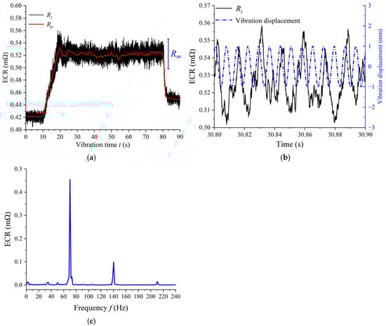 Figure 4 shows the variations in Ri and Rp of one set contact pair within power connectors as a function of vibration time with the fixed vibration frequency of 70 Hz and the fixed vibration amplitude of 2 mm at a load current of 60 A. As seen, the initial average value of the ECR is 0.421 mΩ. The vibration stability is turned on at the 10th second, and then Rg linearly increases to 0.522 mΩ and remains constant for 50 s. At the 80th second, the vibration stops and Rg drops to 0.454 mΩ. Figure 4b provides the enlargement of the ECR variation during 30.80~30.90 s. The power spectral density (PSD) of these instantaneous ECR shown in Figure 4c indicates that the main frequency is 70.19 Hz, which is very close to the fundamental vibration frequency, and a secondary peak occurs at 140.38 Hz (twice of the dominant frequency). The occurrence of the first and second harmonics of ECR is consistent with the results in [10,22,23]. This phenomenon mainly arises from the relative sliding motion between the mated terminals under tangential vibration excitation. Since both the tangential friction force and the vibration acceleration vary sinusoidally, the normal force and the real contact area also fluctuate in a sinusoidal manner, which lead to periodic variations in the ECR. Therefore, the harmonic component at the excitation frequency originates directly from the vibration excitation itself. Meanwhile, within each vibration cycle, the acceleration reaches its maximum magnitude twice in the positive and negative directions, which causes the ECR to reach its minimum value twice as well. As a result, the fundamental frequency components of the ECR signal include both the excitation frequency and its second harmonic.
