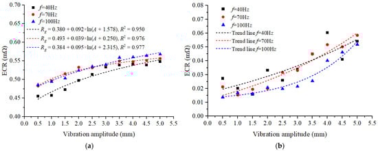 Effect of vibration amplitude on the ECR of power connectors at a load current of 60 A. (a) Rg; (b) Rm.