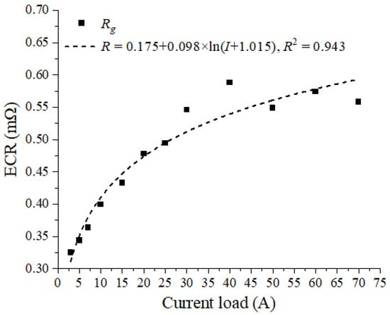 Set the mechanical vibration frequency to 70 Hz and the vibration amplitude to 2 mm, then gradually increase the load current from 3 A to 70 A. It should be noted that vibration is applied only after the power connector reaches a stable temperature at a given load current. The duration of each vibration application is 30 s, and the entire experiment lasts for 2100 vibration cycles. The average ECR values are extracted and plotted in Figure 7. When the load current is lower than 30 A, the ECR increases significantly. After that, as the load current increases, changes in ECR response diminish. At low currents, limited heating allows fretting-induced degradation—such as debris formation, oxide growth, and coating removal—to dominate, leading to a clear increase in ECR. As the current rises, the interface temperature increases sharply, causing local softening and micro-melting of asperities. The resulting thermally assisted material flow can partially enlarge or reconnect conductive paths, offsetting part of the resistance growth from ongoing fretting wear. As a result, the change in ECR decreases and the response appears to approach a saturated state, reflecting a temporary balance between thermal enlargement of contact spots and mechanically induced degradation. This nonlinear relationship could be well described by the logarithmic function, and the goodness of fit is 0.943.