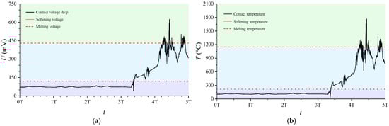 The estimated contact temperature variation (shown in Figure 9b) at the contact position is calculated with the obtained contact voltage drop. As stated in [28], 120 mV corresponds to the softening point of 180 °C of copper material, and 430 mV corresponds to the melting point of 1083 °C of copper material. The continuous increase in contact voltage drop reflects the progressive degradation of the conduction path, which enhances local Joule heating. Then, insufficient heat removal combined with reduced normal pressure accelerates this thermoelectric coupling effect, eventually causing interfacial softening and localized melting. Therefore, we speculate that the contact interface gradually evolves from the initial solid-state contact to the molten contact. In the later stage, multiple recurrent transitions between the soften state and the molten state were observed.