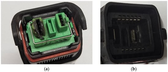 Figure 9a illustrates the variations in the contact voltage drop of power connectors carrying a current of 60 A during five cycles of swept-sine vibration testing. The contact voltage drop behavior appears to be characterized by a few distinct stages. The contact voltage drop remains stable with about 80 mV below 3.27 T swept-sine vibration cycles. There is a slight increment in the contact voltage drop from 3.4 T to 3.8 T (from 120 mV to 200 mV) followed by a rapid increase from 3.8 T to 4.1 T (from 200 mV to 340 mV). Between 4.1 T and 5 T, a large fluctuation in the contact voltage drop is observed, which fluctuates from 340 mV to 600 mV repetitively. After disconnecting the plug and socket of the power connector, it was observed that the plastic housing has melted, as shown in Figure 10. Detaching the plug and the socket, melting traces are also visible on their surfaces.