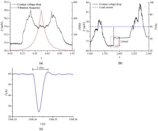 Typical curves of instantaneous contact voltage drop and load current. (a) Contact voltage drop and vibration frequency vs. vibration time during 1 T; (b) contact voltage drop and load current vs. vibration time from 1.5 T to 2.5 T; (c) load current variation during 1506.33 s~1506.36 s.