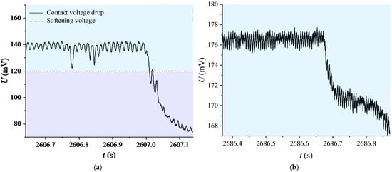 The typical instantaneous contact voltage drop of silver coating contact pairs in the softened status. (a) 2606.7 s~2607.1 s; (b) 2686.4 s~2686.8 s.