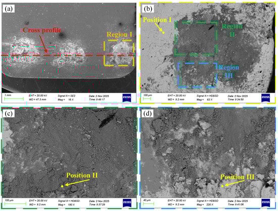 SEM micrographs on the worn silver-plated copper alloy plug component. (a) Overall view; (b) zoomed-in view of Region I; (c) zoomed-in view of Region II; (d) zoomed-in view of Region III.
