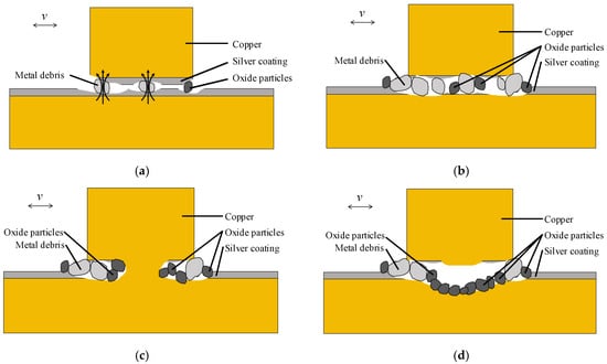 Schematic diagram of the degradation mechanism of the individual contact region in power connectors. (a) Metal debris generation; (b) silver coating wear; (c) copper substrate melting; (d) open circuit failure.