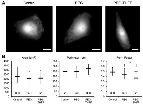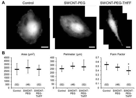 Since the SWCNTs have been chemically functionalized to render aqueous solubility, the question arose if the functional groups by themselves could cause any changes in the morphology of D54MG-EGFP cells. To assess this, D54MG-EGFP cells were treated with the functional groups PEG (1 µg/mL) or PEG-THFF (1 µg/mL), imaged (Figure 2A) and the morphological parameters of the cells were quantified (Figure 2B); the rationale for choosing the concentration of functional groups used is provided in Material and Methods. We found similar results to those obtained when cells were treated with wsSWCNTs, that is, the cells treated with PEG showed no significant differences in all the morphological parameters assessed and PEG-THFF-treated cells showed no significant differences in the area and the perimeter compared to the untreated cells (Figure 2B). However, there was a significant decrease (by ~24%) in the form factor of cells treated with the functional group PEG-THFF compared to the untreated cells as well to that of cells treated with PEG alone (Figure 2B). As the magnitude of this decrease in the form factor was comparable to that seen in cells treated with SWCNT-PEG-THFF (24% vs. 23%, compare Figure 1B and Figure 2B, respectively), morphological changes observed in D54MG-EGFP cells treated with SWCNT-PEG-THFF appear to be caused by the functional group, likely its THFF moiety (as per additional comparison to SWCNT-PEG data), and not the SWCNT backbone itself.
