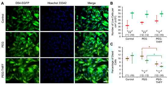 The functional groups PEG and PEG-THFF reduce the cell death rate of D54MG-EGFP human glioma cells. (A) Images of D54MG-EGFP glioma cells (left column) and their corresponding nuclei labeled with the cell permeable nuclear dye Hoechst 33342 (middle column); right column shows the merge of the images. Rows (top-bottom) show the control, PEG-treated and PEG-THFF-treated D54MG-EGFP glioma cells, 2 days post-plating. Scale bar, 50 μm. (B) Summary graph showing the median and IQR numbers of live cells per cm2 of the control, PEG-treated and PEG-THFF-treated coverslips, 2 h (red) and 2 days (green) post-plating. (C) Summary graph showing the median and IQR percentages of dead cells in the above setting. Other annotations as in Figure 3.
