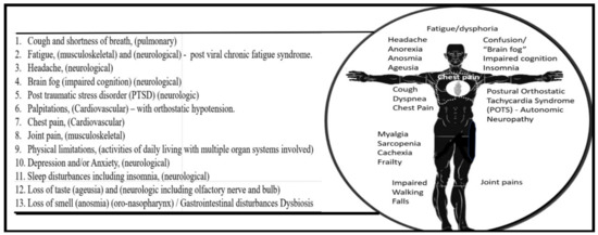 The above listing represents at least 13 of most common associated multiorgan symptoms of individuals following the normal amount of time for healing of this disease known as long COVID or post-acute sequelae of SARS-CoV-2 (LC/PASC). In some cases, such as gastrointestinal disturbances and microbiome dysbiosis, there may be an interaction via a gut–brain axis, which may result in neurological/neuropsychiatric symptoms. Importantly, this list affects individuals of varying ages and occurs in some individuals in reoccurring waves and not a continuous on-going fashion. Importantly, note that at least 7 of the 13 most common listed symptoms involve neurological systems and mechanisms. In some cases, even new symptoms arise well after the time of infection or evolve over time that are capable of interfering with normal activities of daily living [3]. The standing man depicts the various physical locations where some of these LC/PASC clinical symptoms occur in humans and note that at least eight of these symptoms may relate to the central nervous system.