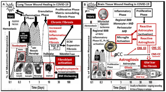 Response to injury wound healing mechanisms in the brain compared to peripheral tissues. Panel A illustrates the timeline of response to injury wound healing mechanisms in peripheral tissues, such as in the skin or the lungs, and includes the various cells and mechanisms involved, which progress to fibrosis. Panel B depicts the divergence in the wound healing response to injury in the central nervous system (CNS). Note that the injury in this case is the microclot/thrombosis and/or microhemorrhage (not shown) of regional brain capillary neurovascular unit(s) (NVUs) in addition to the excessive peripheral proinflammatory cytokines and chemokines (pCC) from the cytokine, viral/virion, redox, and the inflammatory thromboembolic storms as in COVID-19 injury. In the obese diabetic db/db and ob/ob models, the CNS injury may also be due to glucotoxicity and excessive reactive oxygen and nitrogen species (RONS). The resident immune cell in the CNS is the neuroglial microglia cell (MGC). MGCs support the initial acute and chronic inflammatory responses to injury. However, the peripheral monocyte/monocyte-derived macrophages (MΦ) from the regionally activated NVUs are supportive to the resident MGCs to clear debris from CNS microthrombus/clot or micohemorrhage—stroke ischemic and hypoxic injury such that the peripheral inflammatory systems aid the resident MGC population in the CNS inflammatory response to injury. Notably, the NVUs-activated endothelial cells (ECs), pericytes (Pcs), and astrocytes (ACs) of the blood–brain barrier (BBB) may contribute to the CNS cytokines/chemokine (CNSCC) activation as well as the choroid plexus, which forms the blood cerebrospinal fluid barrier (BCSFB) and the meningeal arachnoid BCSFB. Importantly, note that the CNS tissues do not have fibrocytes/fibroblasts in the CNS parenchymal tissues and, therefore, do not form a fibrotic scar as in peripheral tissues such as the lung or skin in Panel A. Instead, the CNS utilizes the glial astrocytes (ACs) to undergo the process of astrogliosis in order to form a glial scar to protect the adjacent neuropil from the injury and damage caused by a micro thrombotic/micro hemorrhagic stroke. Unfortunately, the activated CNS glial cells add to the CNSCC (IL-6, IL-1β, TNFα, growth factor TGF-β) (IL-10 anti-inflammatory)/chemokine (CXCL2 -MCP-1 + others) toxic inflammatory damage to the CNS. Within the glial scar core, the extracellular matrix (ECM) remodeling over time helps to fill in the void created by ischemic injury to cells and the MGCs and macrophage (MΦ) phagocytosis. Additionally, activated glial cells contribute to the ongoing CNS proinflammatory damage to the CNS neurons and neuronal synapses, which may result in impaired synaptic transmission and impaired cognition in long COVID and may support many of the neurological symptoms listed in Figure 1. Panel A adapted with permission CC by 4.0 [9]. AC = astrocyte; BBB = blood–brain barrier; BM = basement membrane; CNS = central nervous system; CNSCC = central nervous system cytokines/chemokines; CXCL2/MCP-1 = Chemokine (C-X-C motif) ligand 2/ monocyte chemotactic protein-1; EC = endothelial cell; ECM = extracellular matrix; IL-1β = interleukin-1 beta; IL-6 = interleukin-6; IL-10 = interleukin-10 (anti-inflammatory cytokine); MΦ = macrophage; NVU = neurovascular unit; pCC= peripheral pro-inflammatory cytokines/chemokines; Pc = pericyte; RONS = reactive oxygen nitrogen species; ROS =reactive oxygen species; TGF-β = transforming growth factor-beta; TNF-α = tumor necrosis factor alpha.