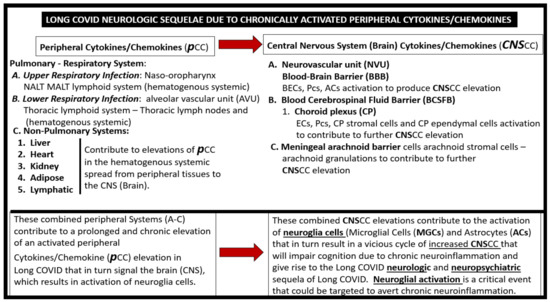 Possible sequence of neurologic sequelae in LC/PASC due to activation of peripheral cytokine/chemokines (pCC) and Central Nervous System Cytokine/Chemokines (CNSCC). BECs = brain endothelial cells; ECs = endothelial cells; NALT = nasopharynx- associated lymphoid tissue; MALT = mucosa-associated lymphoid tissue. Pcs = pericytes.