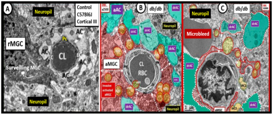 Activated microglia cells (aMGCs) and astrocytes (ACs) in female diabetic db/db mice at 20 weeks of age. Panel A illustrates the ramified MGC (rMGC) that is surveilling the neurovascular unit blood–brain barrier (NVU BBB) interface in cortical layer III of a control C57BL/6J mouse at 20 weeks of age. Panel B demonstrates an activated MGC (aMGC), which appears to be totally encompassing the NVU BBB and note the swollen aberrant mitochondria (aMt) (pseudo-colored yellow responsible for mitochondria-derived increased reactive oxygen nitrogen species (RONS). Furthermore, note the detached and retracted activated astrocytes (drACs) (pseudo-colored cyan). Panel C also depicts drACs (pseudo-colored cyan) and note the partial encroachment of an aMGC. This capillary lumen appears nearly closed and also depicts a nearby well-demarcated grey homogeneous region compatible with a microbleed. Panels A–C are from cortical layer III in the frontal cortex just anterior to the midline of the brain in the diabetic db/db mouse at 20 weeks of age. Importantly, the tight and adherens junctions (TJ/AJ) are attenuated and/or lost in the female db/db mouse models at 20 weeks (not shown). Magnification ×2000; scale bar = 1 μm Panels A–C. Figures adapted with permission by CC 4.0 [24].
