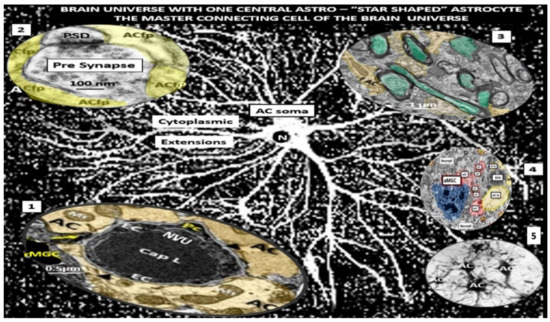 Astrocytes (ACs) are the most abundant cell in the human brain and with their vast connections to multiple other cell types including themselves are the master connecting and communicating cells within the human brain (Figure 6) [25,27,28,29]. This large AC cellular presence in the brain with their vast cell–cell communications via gap junctions may be viewed as the brain’s functional syncytium [25,30].