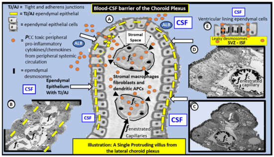 Illustration and TEM images of the blood–cerebrospinal fluid barrier (BCSFB) of the choroid plexus (CP). Panel A is a hand-drawn computer-assisted illustration that depicts a single CP villus protruding into the blue background of the cerebrospinal fluid (CSF) within the lateral ventricle and note that the villus is lined by cuboidal shaped epithelial ependymal cells (white arrows) in the central portion of this image. Furthermore, note that, when these cells lose their tight and adherens junctions (TJ/AJ) (yellow bars), they allow for the escape of proinflammatory peripherally derived cytokines/chemokines (pCC) (orange spheres) or stromal cell-derived CNS CC as well as albumin (ALB) to leak into the cerebrospinal fluid CSF. Panel B demonstrates a transmission electron microscopic (TEM) morphology of a longitudinal CP villus protruding into the CSF (blue color) from a control C57BL/6J model. Note the fenestrated capillaries (fcap) within the villus and the lining ependymal epithelial cells with known TJ/AJ (inserted yellow bars). Panel C depicts a TEM cloverleaf-like image of the CP villus from the BTBR ob/ob diabetic model with marked vacuolization and vesiculation of the adjacent basilar infoldings. Note the intense electron dense staining of the microvilli at the CSF apical surface of the ependymal cells by lanthanum nitrate staining and also in Panel D which depicts the epithelial glycocalyx in intimate contact with the apical ependymal microvilli. Panel D illustrates a TEM image of the tip of the cloverleaf-like villus protruding into the CSF. Additionally, note the intense electron dense staining of fenestrated capillary (fc within the villus that is stained with lanthanum nitrate and depicts an endothelial glycocalyx) and note the important lack of lanthanum staining in the superior fcap. Panel E is an illustration that demonstrates the adjacent ependymal epithelial cells that line the entire lateral ventricles and do not have TJ/AJ; instead, they have leaky cell–cell attachments consisting of desmosomes (thin black bars) that allow molecules to move bidirectionally from the CSF to the underlying subventricular zone (SVZ) in the interstitial fluid (ISF) compartment. This leaky epithelium that lines the ventricles allow molecules to move bidirectionally from the CSF compartment to the SVZ ISF compartment based on a concentration gradient. The TEM images were acquired from the lateral ventricles of the control non-diabetic and the diabetic BTBR ob/ob model of obesity and type 2 diabetes mellitus. Illustrations in Panels A and E are not to scale, while Panels B–D have intact scale bars (5 μm in B,C and 2 μm in D) in lower left of each TEM image. It is important to note that the toxic proinflammatory cytokines and chemokines (orange spheres) are able to pass the blood–cerebrospinal fluid barrier if the TJ/AJ are rearranged, attenuated, and/or lost, in addition to their respective stromal endothelial cells and ependymal cellular receptors to the PCC dysfunctional CP. Note the key on the upper left-hand portion of this image. Inserts B, C and E adapted with permission by CC 4.0 [37].