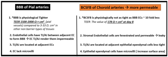 Importantly, the choroid plexus is more vulnerable to become injured by neurotoxins as compared to the neurovascular unit blood–brain barrier since its stromal capillaries are fenestrated and its ependymal tight junctions/adherens junctions are not as tight as compared to the brain endothelial cells of the blood–brain barrier (Figure 9) [35,36,37,38,39,40,41].