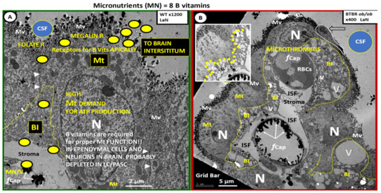 Ependymal epithelial cells of the choroid plexus (CP) are remodeled in the obese diabetic BTBR ob/ob models as compared to controls. Panel A depicts the morphology of a normal non-diabetic control wild type (WT) mouse model. Note the marked presence of the highly electron dense mitochondria (Mt) in order to produce ATP to run the high-energy demands of ependymal transport systems. Importantly, note the specialized folded labyrinth structure of basilar infoldings (BI) outlined in yellow dashed lines that appear to be markedly remodeled in the BTBR ob/ob models in Panel B. In addition, note the yellow spheres that represent micronutrients/vitamins (eight B vitamins and ascorbate-vitamin C) (MN/V) transport within the ependymal cells that are eventually found within the cerebrospinal fluid (CSF) and in the CNS extracellular space. Panel B depicts the marked remodeling change in the BI (currently thought to contribute to the paracellular diffusion barrier consisting of tight and adherens junctions (TJ/AJ) of the ependymal cells of the CP), as demonstrated in Figure 6 with vacuolization and vesiculation (V and v, respectively) and marked expansion into the cytosol of the epithelial ependymal cells of the obese diabetic BTBR ob/ob models. This expansion of the BI with V and v may result in the reorganization and the attenuation and/or loss of the ependymal TJ/AJs. The V and v within ependymal cells have also been identified in traumatic brain injuries. The excessive and chronic intake of alcohol and vacuolization is also a prominent finding in ischemia and ischemia–reperfusion so the remodeling of the BIs may be a sign of early cellular damage from multiple different etiologies, as demonstrated in the obese diabetic insulin resistant BTBR ob/ob model. Additionally, note the loss of the endothelial glycocalyx and the presence of a microthrombus in the upper fenestrated capillary (fCap) where the BI demonstrate the most expansion within the ependymal cytosol. Panel B insert upper left with greater contrast and brightness to better illustrate the extensive remodeling of the BI in the BTBR ob/ob models. Both Panels A and B were stained with lanthanum nitrate to define the presence of a glycocalyx on both the capillary endothelial cells and the apical cerebrospinal fluid (CSF) surface microvilli (Mv), which significantly expand the surface area of the epithelial ependymal cells. The absent staining of the endothelial glycocalyx with extensive BI remodeling expansion may be one reason that this microthrombus has formed in the fenestrated microvessel and may also contribute to dysfunctional ependymal barrier functions with increased CNSCC within the CSF in addition to the ischemia induced locally by this microthrombus. Panels A and B were adapted with permission by CC 4.0 [33]. Adapted with permission by CC 4.0 [37]. Panel A magnification ×1200; scale bar = 2 μm and Panel B magnification ×400; scale bar = 5 μm. ISF = interstitial fluid; N = nucleus; R = receptor.