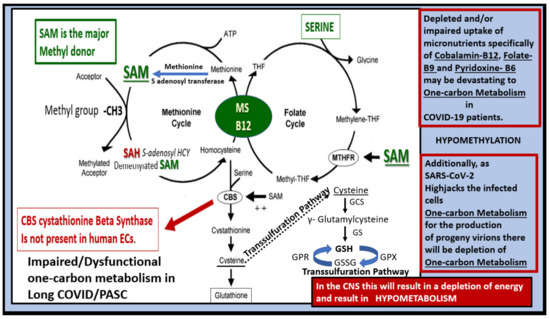 When there is insufficient uptake or depletion of micronutrients, the brain cannot continue to function normally and the result will be dysfunction or disease, i.e, a loss of homeostasis, such as in the dysfunction of FOCM which occurs in both acute COVID-19 and post-COVID-19 LC/PASC [68]. Furthermore, as SARS-CoV-2 infects host cells, it high-jacks the normal one-carbon cellular metabolic machinery. This places significant demands on the host cell methyl-groups (-CH3) in order to replicate its ribonucleic acid (RNA) and provide RNA capping to produce large numbers of progeny virions. Therefore, SARS-CoV-2 infection leads to increased demands of the host cells one-carbon methyl-groups via its excess in PCC and CNSCC and the associated increase in redox-oxidative stress (reactive oxygen nitrogen species) to promote other disturbances of one-carbon metabolism. Additionally, SARS-CoV-2 may disrupt the coordination between remethylation and transsulfuration through inadequate amounts of the methyl-donor SAM. Furthermore, there may be serine depletion in addition to elevated Hcy and glutathione (GSH) depletion and the dysfunctional oxidized cofactor cobalamin (vitamin B12). Briefly, it appears that SARS-CoV-2 not only stresses the host cell one-carbon metabolism but also impairs the supply of methyl groups provided by SAM (Figure 12) [68].