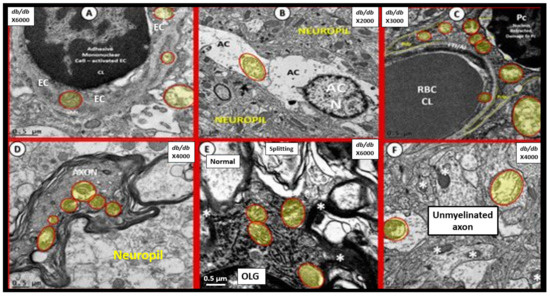 Aberrant mitochondria (aMt) readily identified in multiple cell types of 20-week-old diabetic db/db Mice. Ultrastructural aMt (pseudo-colored yellow and outlined in red) were readily indentified in db/db mice in the following cells: endothelial cells (ECs) and astrocyte foot processes (ACfps) of the neurovascular unit (NVU) db/db (DBC) mice as in Panel A. Furthermore, aMt were found in protoplasmic astrocytes (ACs) in Panel B and aMt were found in pericytes (Pcs) of the NVU in Panel C. Additionally, note the aMt in the myelinated axoplasma in Panel D and the aMt found in oligodendrocytes in Panel E and the aMt of unmyelinated axons in Panel F. Magnifications ×6000; bar = 0.5 μm in Panels A and E and magnification ×2000; bar = 1 μm in Panel B and magnification ×4000; bar = 0.5 μm in Panels D,F and magnification ×3000; bar = 0.5 in Panel C. Note normal electron dense mitochondria in Panel F (asterisks). In addition, note aMt in activated microglial cells (aMGCs) in Figure 5B. Figure adapted with permission by CC 4.0 [28].