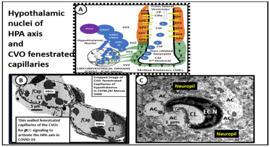 In response to critical illnesses and marked psychogenic stress (including physical, emotional, or immunological stresses, such as excess PCC), the hypothalamic–pituitary–adrenal (HPA) axis is able to orchestrate the systemic release of cortisol in human and corticosterone in rodents referred to as glucocorticoids (generally considered anti-inflammatory immunomodulators) [74]. The brain is known to respond to peripheral systemic cues, such as inflammation and the increased PCC that occurs due to the cytokine storm in acute COVID-19 and possibly LC/PASC. While cytokines and chemokines are known to have receptors on brain endothelial cells in the neurovascular unit blood–brain barrier and the blood–cerebrospinal fluid barrier, they are also known to signal the hypothalamus early on in COVID-19 via the leaky fenestrated circumventricular organ (CVO) capillaries (Figure 14).