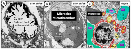 Comparison of cerebral pial capillaries in cortex and choroidal capillaries in choroid plexus villus with and without microclots, microthromus, and microbleeds—microhemorrhages. This image compares a normal healthy capillary to capillaries with a microclot and a microbleed. Panel A illustrates a morphological normal open capillary within a choroid plexus villus that is perfused fixed with lanthanum nitrate to stain the endothelial glycocalyx (ecGCx) (arrows) and note that the capillary lumen (CL) is open and depicts the electron dense stained ecGCx (arrows) from a 20-week-old diabetic BTBR ob/ob model. Panel B resides within the same choroid plexus villus, as seen in Panel A; however, it does not have an ecGCx stain with lanthanum nitrate fixation and there appears to be a total occlusion of the capillary lumen with a microthrombus or microclot consisting of tightly packed adherent red blood cells, which are not usually seen when models have been perfusion-fixed prior to sacrifice, as seen in Panel A. This totally occluded capillary lumen will not allow for proper oxygenation or metabolic nutrition of surrounding tissues that will become ischemic and may result in adjacent basilar vascuolization/vesiculation in the basilar infoldings of the epithelial ependymal cell, as noted in previous Figure 10B. Panel C depicts a microbleed or hemorrhage adjacent to a dysmorphic highly remodeled capillary of the neurovascular unit of the BBB in cortical layer III of the 20-week-old db/db diabetic model with astrocyte activation detachment and retraction (drAC) (pseudo-colored cyan) and activated microglia (aMGC) (pseudo-colored red). Both the microthrombus microclot and microbleed will instigate the response to injury wound healing phase of increased inflammation and, thus, add to the pool of increased central nervous system cytokines/chemokines (CNSCC) and create a vicious cycle of micro-clot/bleeds and local inflammation. Scale bars = 2 μm in Panels A and B; 1 μm in Panel C. Figures adapted with permission by 4.0 [28,37]. EC N = endothelial cell nucleus; Pc N = pericyte nucleus.