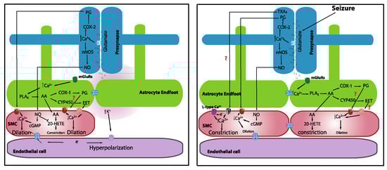 We know a fair amount about cerebrovascular autoregulation and its critical role in cerebral blood flow (CBF), as well as the players involved in the process, but the underlying mechanistic details remain incompletely understood []. Even less is known about cerebral autoregulation in pathological brain states, such as seizures. Similarly, much remains to be learned regarding NVC mechanisms, but it is generally accepted that, under normal physiological conditions, increases in neuronal activity trigger a release of synaptic glutamate that can ultimately induce an increase in CBF via two major pathways: (1) neuron signaling directly to blood vessels and (2) neuron signaling indirectly to blood vessels via astrocytes [,]. Importantly, despite a general understanding of cerebral autoregulatory and NVC processes under physiological conditions, NVC during pathological states, such as seizures, remains poorly defined [,]. Electrographic seizures are sustained bouts of hypersynchronous and hyperexcited neuronal activity that impose an enormous metabolic demand on the vasculature []. Whether NVC during a seizure (ictal) operates as it does under normal physiological conditions remains an outstanding question. Furthermore, it is still not clear how CBF is affected during preictal, ictal, and postictal periods [,]. Most reports have tended to focus on the ictal period, with less attention devoted to the postictal period. In this brief review, we provide an overview of the current knowledge state of physiological cerebrovascular autoregulation and NVC and discuss seizure-related alterations in NVC during ictal and postictal periods. Insights into these processes will help to consolidate our understanding of CBF regulation and provide the clarity that is needed to interpret data from functional imaging techniques, such as functional magnetic resonance imaging (fMRI), which are used as proxies for neuronal activity or as diagnostic or prognostic tools in pathologies like epilepsy.