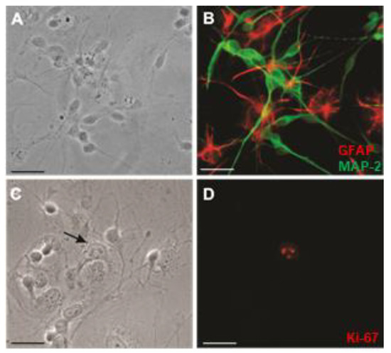Human NT2/D1 precursor cells grew rapidly, with a doubling time of 25 ± 4.2 h, and morphologically resembled neuroepithelial cells [31]. A 4-week application of retinoic acid resulted in a terminally differentiated mixed population of NT2/N neuron-like cells and NT2/A astrocyte-like cells [32,33,36]. It has been previously established by Pleasure et al., that only 4.4 ± 0.8% of the initial population becomes terminally differentiated into NT2/N neurons [30]. After 3–4 weeks of growth in the culture, NT2/N was established as a network of interconnected neurons and were found resting on top of a monolayer of NT2/A that morphologically resembled “type I or protoplasmic” astrocytes (Figure 1A,C). NT2/N neurons did not incorporate bromodeoxyuridine (not shown) or show immunoreactivity to the anti-Ki-67 antibody [37], a widely used proliferation marker (Figure 1D); only 6.2 ± 1.0% of astrocytes were labeled with Ki-67 after 4 weeks of growth in the culture. In the mixed cultures, NT2/N expressed a microtubule associated protein-2 (MAP-2), a neuron-specific filament, and NT2/A expressed a glial fibrilliary acidic protein (GFAP), a glial-specific intermediate filament (Figure 1B).