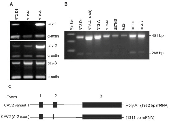 - Kogo, H.; Ishiguro, K.; Kuwaki, S.; Fujimoto, T. Identification of a splice variant of mouse caveolin-2 mRNA encoding an isoform lacking the C-terminal domain. Arch. Biochem. Biophys. 2002, 401, 108–114. [Google Scholar] [CrossRef]