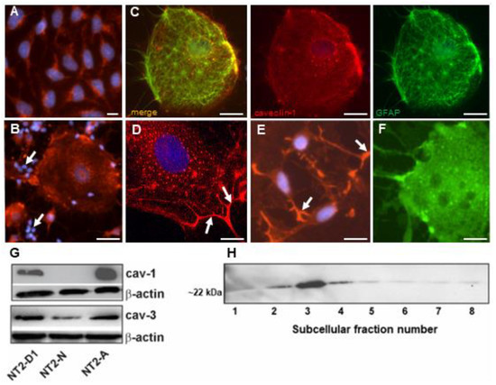 Western blot analysis of protein lysates revealed a single immunoreactive band of caveolin-1 at ~22 kDa, which was upregulated by ~1.5-fold in NT2/A astrocytes, compared to NT2/D1 precursors and being undetectable in NT2/N (Figure 3G). On the other hand, a single immunoreactive band of caveolin-3 at ~20 kDa (comparable to the size of muscle caveolin-3), was expressed at similar levels in undifferentiated and differentiated NT2 cells (Figure 3G). To determine if caveolin-1 was found in caveolae, NT2/A astrocytes were subjected to subcellular fractionation under detergent-free conditions to isolate caveolae [34]. As shown in Figure 3H, the light-density fractions 2, 3 and 4 showed the highest caveolin-1 immunoreactivity, as previously demonstrated in other cell types, such as primary cultures of rat type I astrocytes, C6 glioma and human glioblastoma cells [13,14,19]. Taken together, these data strongly support the notion that the expression of caveolins can be regulated by retinoic acid, and caveolin-1 and -2 were induced in terminally differentiated NT2/A astrocytes but not in NT2/N neurons.