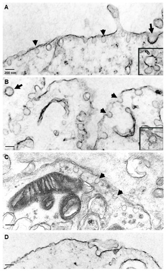 In order to study the distribution of caveolae, various NT2 cultures were processed and subjected to TEM. As shown in Figure 4, caveolae were easily distinguishable from the clathrin-coated pits by their small size, shape and lack of the clathrin basket. Clathrin-coated pits and vesicles generally appeared as ~250–300 nm electron-dense invaginations of the plasma membrane (Figure 4A,B,D), which were observed in all the NT2 cell types examined. Caveolae appeared as small pear-, omega- or flask-shaped invaginations of the plasma membrane, which were detected at an abundant level in NT2/A astrocytes, grown as pure (Figure 4A) or mixed cultures (Figure 4B). Caveolae-like structures opening to the outside milieu were found decorating the plasma membrane of NT2/N neurons (Figure 4C), and a large number of free vesicular structures were also seen immediately below the plasma membrane and in the cytoplasm. Additionally, clusters of interconnecting caveolae forming rosettes were also seen in the NT2/A cultures (Figure 4A,B, insets). In contrast, caveolae-like structures were expressed at very low numbers in NT2/D1 precursors (Figure 4D). Caveolae size was determined by measuring their diameter from the TEM photomicrographs (Table 2). All cell types expressed caveolae-like structures at a remarkably constant diameter of between 80 and 100 nm.