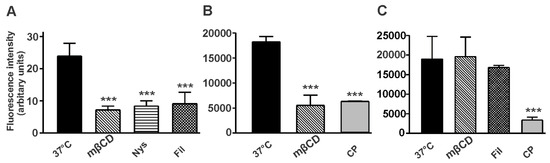 The amount of CTX-B endocytosed and the effect of cholesterol depleting agents in various NT2 cell types was also quantitated by fluorescence-based assays (Figure 8). Incubation of NT2/D1 cells at 37 °C for 30 min with CTX-B did not result in a significant internalization of CTX-B; no effect was observed with the inhibitors of either the caveolae- or clathrin-pathway. On the other hand, NT2/A astrocytes and NT2/N neurons resulted in the accumulation of CTX-B on the plasma membrane and subsequent internalization; however, this uptake was mediated by separate pathways. In NT2/A astrocytes, CTX-B internalization was inhibited to a similar level by the inhibitors of the caveolin- and clathrin-pathway (Figure 8A,B). By contrast, in NT2/N neurons, mβCD and filipin had no effect on the rate of CTX-B internalization while treatment with CP resulted in a statistically significant reduction of CTX-B internalization (Figure 8C).