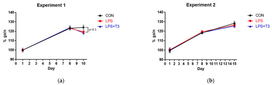 As shown in Figure 1, BW increased in all three groups, and no significant differences were observed between the vehicle and T3 treatments in the 7 days before the LPS injection. However, significant decreases in BW were observed after the LPS injection in both the LPS and LPS + T3 groups on Day 10. BW was slightly lower in the LPS groups than in the CON group (p = 0.1), whereas no significant differences were noted between the LPS and LPS + T3 groups (Exp 1; Figure 1a). BW increased in both the LPS and LPS + T3 groups on Day 15 (Exp 2; Figure 1b).