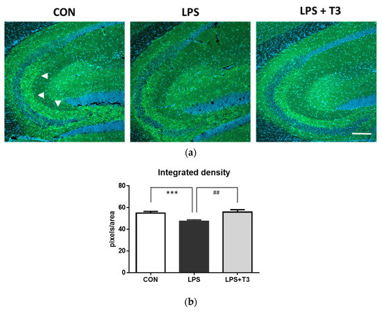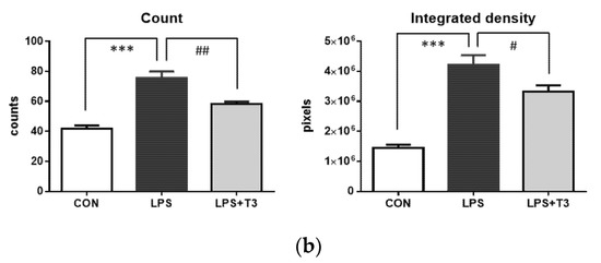 With the systemic administration of LPS-activated microglia in the hippocampus, morphologically, many ameboid-type microglia were observed in the LPS group, whereas ameboid-type microglia and ramified-type microglia decreased and increased, respectively, in the LPS + T3 group (Figure 2a). The number of Iba1-positive cells was significantly higher in the LPS group than in the CON group, and this increase was significantly suppressed in the LPS + T3 group. Similar results were obtained for the integrated density of Iba1-positive cell signals (Figure 2b).