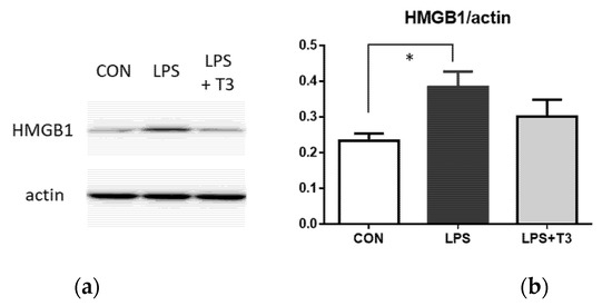 The activation of microglia is an inflammatory response in the brain. HMGB1 is one of the damage-associated molecular patterns (DAMPs) and a marker of delayed-onset inflammation. The expression of HMGB1 in the hippocampus was significantly higher in the LPS group than in the CON group, while the LPS + T3 group did not show any significant suppression in this timepoint analysis (Figure 3).