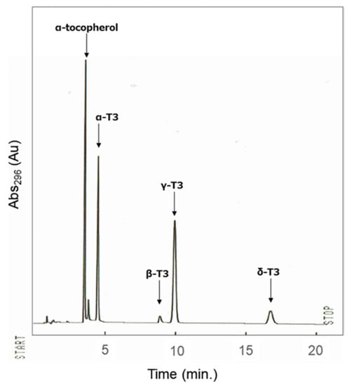 The composition of the tocotrienol mixture used in the present study was examined by an HPLC analysis (Figure 5). The quantification of each compound was calculated by preparing a calibration curve of the peak separated by HPLC using the corresponding standard. The results obtained showed that the mixture (200 mg) comprised α-tocotrienol (55.8 mg), β-tocotrienol (5.4 mg), γ-tocotrienol (92.6 mg), and δ-tocotrienol (13.9 mg).