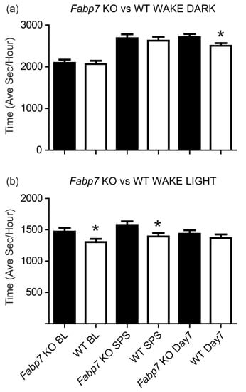 In order to determine whether Fabp7 plays a role in the interaction between sleep–wake behavior and PTSD-like phenotype, we measured sleep and wakefulness from EEG data of Fabp7 KO and WT control mice prior to treatment (baseline), immediately following SPS, and after the 7-day window post-SPS. The experimental outline is shown in Figure 1. During the active-phase (dark period), we did not observe any differences in baseline wake time, or immediately following SPS (Figure 2a). However, after the 7-day window when SPS treatment is known to cause sleep-associated long-lasting effects on fear-associated behavior [12], we observed an increase in wake in Fabp7 KO versus WT mice (Figure 2a). These effects were reciprocal in the inactive-phase. Fabp7 KO mice had an increase in wake during the light phase in baseline and immediately following SPS treatment (Figure 2b). After the 7-day window post-SPS, there were no differences in wake time between Fabp7 KO and WT mice (Figure 2b). These data suggest that the astrocyte-expressed Fabp7 impairs the normal sleep-wake responses to single-prolonged stress in mice in a time-of-day dependent manner.
