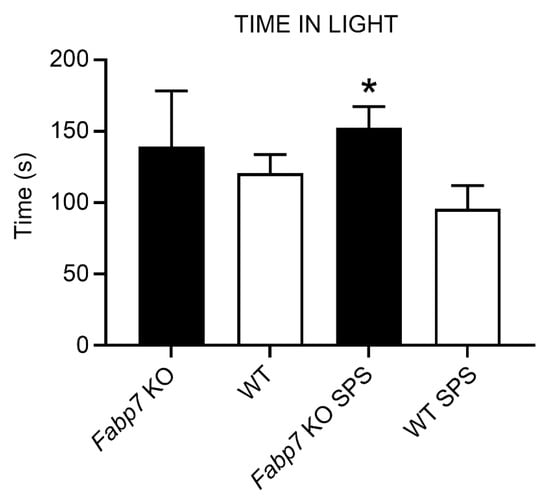Fabp7 KO SPS mice spend increased time in light compared to WT SPS mice. Time spent in the lit side of the light–dark box was measured while mice were able to freely explore the entire cage. One-way ANOVA showed statistical difference between the groups, with a Tukey multiple comparisons test showing that Fabp7 KO SPS mice spent more time in the lit compartment than WT SPS mice, * = p value < 0.05.