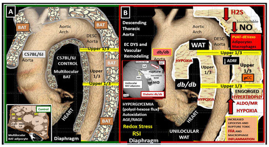 The perivascular adipose tissue (PVAT) of descending aorta in the obese, diabetic db/db model undergoes transdifferentiation from multilocular brown adipose tissue (BAT) to unilocular white adipose tissue (WAT). (A) demonstrates the normal PVAT depot, which consists of multilocular brown adipose tissue (BAT) in control models (insert). (B) depicts the transdifferentiation from BAT to WAT with hypertrophic unilocular adipocytes that are prone to rupture and secrete multiple cytokines/chemokines and PVAT-derived small extracellular vesicles exosomes (PVAT-dEVexo) in the obese, diabetic db/db mice (insert). Interestingly, the transdifferentiation of BAT in controls to WAT in the db/db models is associated with aortic vascular stiffing. This modified image is published with permission by CC 4.0 [20]. ADRF = adipose- derived relaxing factor; AGE/RAGE = advanced glycation end products and their receptor for AGE; ALDO = aldosterone; DESC = descending aorta; Dys = dysfunction; EC = endothelial cell(s); ECM = extracellular matrix; FFA = free fatty acids; H2S = hydrogen sulfide; MR = mineralocorticoid receptor; NO = nitric oxide; OS = oxidative stress; pCC = peripheral cytokines/chemokines; RSI = reactive species interactome.
