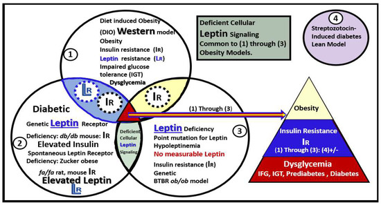 Venn diagrams depicting multiple models in sets/circles (1 through 3) of brain remodeling. The model most studied was the obese, insulin-, and leptin-resistant (IR and LR, respectively) db/db mouse model at 20 weeks of age (circle 2) [14,20,25,26,30,31,32,33,34,35,36,37,38]. Furthermore, the Zucker fa/fa rat (circle 2) [25,26,27], diet-induced obesity (DIO) Western (circle 1) [25,26,28,31], and most recently the novel BTBR ob/ob mouse (circle 3) [39] in addition to the streptozotocin-induced diabetic model (circle 4-upper right colored in purple) [29] were studied. Note the overlapping circles depicting IR and LR between circles 1 and 2 (light blue ellipse) and only IR between circles 1 and 3 that share IR (yellow ellipse). Importantly, note that where all three circles (1–3) of the Venn diagram intersect the arrow points to the common features of obesity, IR, dysglycemia, prediabetes, and manifest diabetes (multicolored triangle lower-right). Only the db/db, Zucker obese fa/fa, and the Western models share in common LR. Deficient cellular leptin signaling is common in all models studied (circles 1–3). This modified image is provided with permission by CC 4.0 [39]. IFG = impaired fasting glucose; IGT = impaired glucose tolerance; IR = insulin resistance; LR = leptin resistance.