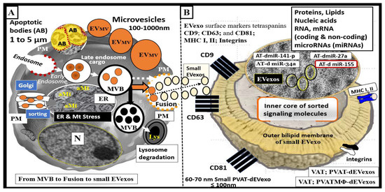 Notably, many publications regarding AT derived-exosomes are related to their protective roles such as adipocyte-derived mesenchymal stem cells with anti-inflammatory and regenerative potential. However, we are only recently beginning to learn of the potential negative and damaging roles that obese adipocytes (VAT and PVAT) are playing in multiple diseases such as occurs in obesity, MetS, IR, LR, and T2DM [50,51,52]. This overview will primarily focus on small EVexos that are generated in PVAT adipocytes (PVAT-dEVexos) and macrophages (PVATMΦ-dEVexos) as observed with TEM in the obese, IR, LR, female, diabetic, db/db preclinical rodent models. Extracellular vesicles including exosomes, microvesicles, and apoptotic bodies are identified in the VAT-PVAT of obese, prediabetic, and manifest diabetic models such as occurs in the db/db preclinical models (Figure 3).