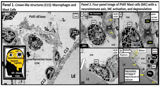 Crown-like structures (CLS) with activated macrophages (MΦ), a neuroimmune axis (triactome), and activated Mast Cells (MC) with degranulation. Panel 1 depicts three activated and attached MΦs to the plasma membrane (pm) of a hypertrophic adipocyte within the Perivascular adipose tissue (PVAT) of the descending aorta. Furthermore, note a MC and a fibroblast (FB). Insert depicts neuroinflammation within the brain and impaired cognition due to obesity, type 2 diabetes mellitus (T2DM), and PVAT metainflammation. Panel 2 with (A–D). (A,B) depict unmyelinated neurons innervating a MC that is also in contact with an adipocyte creating the triactome (neuro–immune–adipose interaction). (C) depicts the homing of a MC to the pm of the unilocular adipocyte that is undergoing rupture (open arrow). (D) depicts the actual fusion of the MC and its active degranulation of its mast cell granule (MCg) to fuse with the pm of the adjacent unilocular adipocyte. Importantly, note the liberation of extracellular vesicle microvesicles (EVmv) (yellow arrows) measuring ~100–120 nm and larger than small EVexosomes (<100 nm). These modified images are provided with permission by CC 4.0 [20]. ECM = extracellular matrix; Ld = lipid droplet; N = nucleus; NT = neurotransmitters; PVAT-dEVexos = perivascular adipose tissue-derived extracellular small exosomes; UN = unmyelinated neuron.