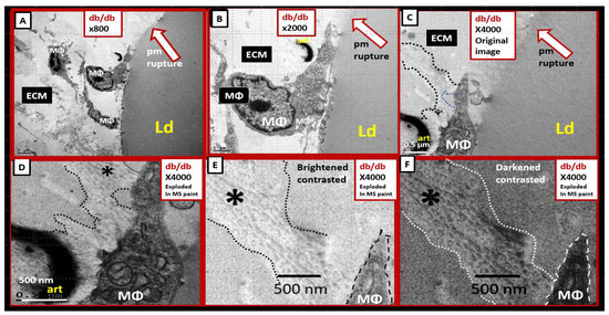 Perivascular adipose tissue macrophage-derived extracellular vesicle small exosomes (PVATMΦ-dEVexos) in the descending thoracic of the obese, diabetic db/db models. (A–C) depict the increasing magnification (×800–×4000) of the PVAT macrophage that is adherent to the adipocyte plasma membrane (pm). (D–F) depict the progressive exploded images of panel C in Microsoft paint with intact scale bars. Note how the protrusions from the PVAT macrophage depict definite multiple small extracellular vesicles (sEVs) (outlined with dashed lines and labeled with asterisks). (E) is brightened and contrasted and (F) is darkened and contrasted to better illustrate these sEVs that are definitely less than 100 nm (~ 60–70 nm and similar to adipocyte derived EVexos) in diameter allowing them to be considered PVATMΦ-derived small exosomes (PVATMΦ-dEVexo). Similar to Figure 5, these images of PVATMΦ-dEVexos were not observed in control models or db/db treated for 10-weeks with the antidiabetic sodium-glucose transporter 2 (SGLT2) inhibitor empagliflozin [20]. These modified images (highly magnified) are provided by CC 4. [20]. Magnifications and scale bars are identified in each panel.