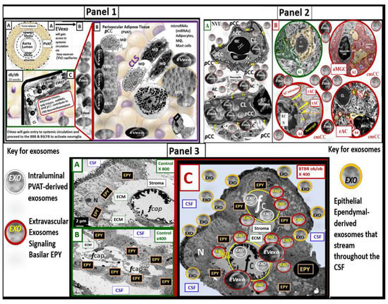 Illustration demonstrating how the perivascular-derived small extracellular vesicle exosomes (PVAT-dEVexos) and PVAT macrophage-derived extracellular vesicles exosomes (PVATMΦ-dEVexos) signals the brain via the endocrine, inter-organ, and long-distance signaling by the systemic circulation. Panel 1 depicts PVAT-dEVexos that are synthesized and secreted by the activated, stressed, and ruptured hypertrophic adipocytes and the accumulated activated crown-like structure (CLS) macrophages to enter the systemic circulation to enter the brain (images (A–C)). Panel 2 depicts the systemically derived PVAT-dEVexos and PVATMΦ-dEVexos entering the neurovascular unit blood–brain barrier (BBB) (image (A)) and activating the microglia and the resulting reactive AC (image (B)). Panel 3 depicts the PVAT-dEVexos readily entering the blood-CSF barrier (BCSFB) via its fenestrated capillaries (images (A,B)) to activate the choroid plexus basilar ependymal cells (EPY), which in turn result in the synthesis and secretion of EPY-derived EVexos that traverse and stream across the CSF to enter the epithelial ependymal lining cells of the lateral ventricles of the CSF that then enter the CNS interstitium in the subventricular zone to undergo bulk flow throughout the CNS interstitium and result in microglia activation and the subsequent formation of reactive astrocyte formation (image (C)). Note the color-coded key describing the different exosomes. Please see the text for further descriptions of these processes. Of course, the exosomes depicted are not to scale in order to emphasize their importance. The modified cropped transmission electron microscopic images were provided with permission by CC 4.0 [20,32,33,34,36]. AC = astrocyte; aMGC = activated MGC; aMt = aberrant mitochondria; CL = capillary lumen; cnsCC = central nervous system cytokines/chemokines; CSF = cerebrospinal fluid; EC = endothelial cell(s); ECM = extracellular matrix; EPY = ependymal cells of the choroid plexus; EVexos = extracellular vesicle exosomes; fCap = fenestrated capillary; microRNA = micro ribosomal nucleic acid; MΦ = macrophage; NVU = neurovascular unit; pCC = peripheral cytokines/chemokines; rAC = reactive astrocyte; WBC = white blood cell.